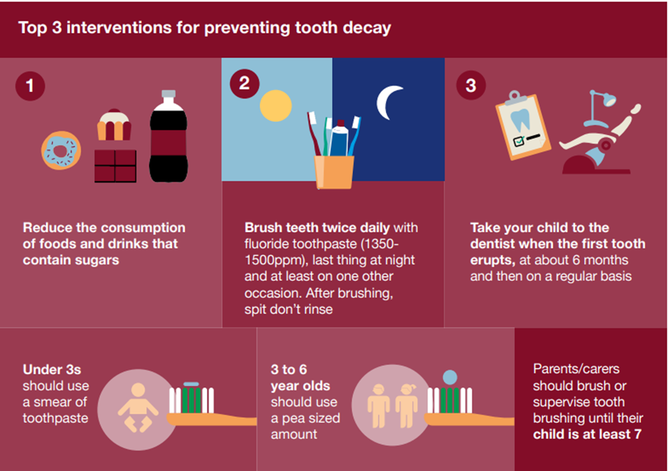 Good oral health is now part of the new national Early Years Foundation Stage Framework. This is because tooth decay is largely preventable yet it remains a serious problem. In 2015, a quarter of five-year-olds had experienced tooth decay, having on average 3 or 4 teeth affected. The areas with poorer dental health tend to be in the north and in the more deprived local authority areas. In 2015 to 2016 the cost of tooth extractions was approximately £50.5 million among children aged 0 to 19 years. There were 7,926 episodes of children aged under 5 years having 1 or more teeth extracted in hospital because of tooth decay. Poor dental health impacts not just on the child’s health but also their wellbeing and that of their family. Children who have toothache or who need treatment may have pain, infections and difficulties with eating, sleeping and socialising. A quarter of 5-year-olds have tooth decay when they start school. Children who have toothache or who need treatment may have to be absent from school and parents may also have to take time off work to take their children to a dentist or to hospital.